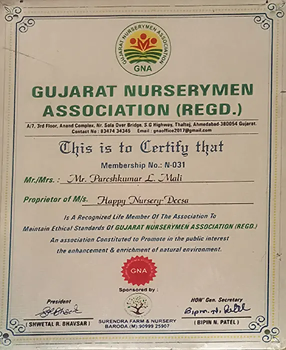 • Is A Recognized Life Member Of The Association To Maintain Ethical Standards Of GUJARAT NURSERYMEN ASSOCIATION (REGD.) An association Constituted to Promote in the public interest the enhancement & enrichment of natural environment.